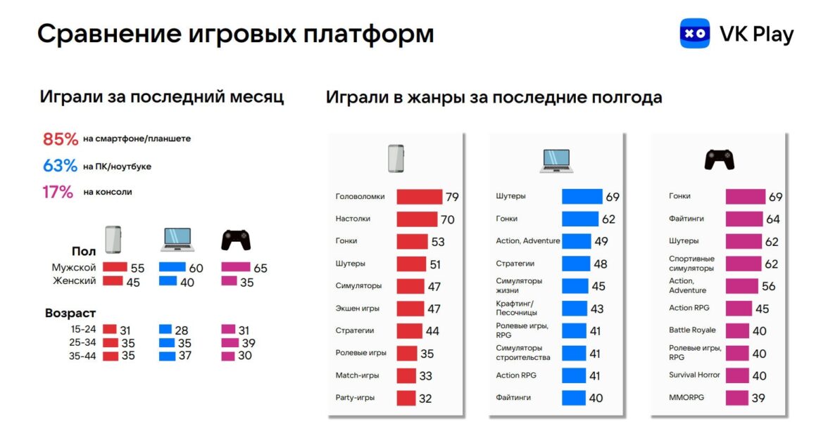 Как выглядит портрет российского геймера по результатам исследования VK Play? Большинство игроков на всех устройствах все еще мужчины, но количество девушек растет. 85% играют на смартфонах/планшетах, 63% – ПК/ноутбук, 17% – консоль. Судя по результатам, речь идет о широкой аудитории фанатов интерактивных развлечений. Иначе как объяснить высокую позицию «гонок» на всех платформах ¯_(ツ)_/¯