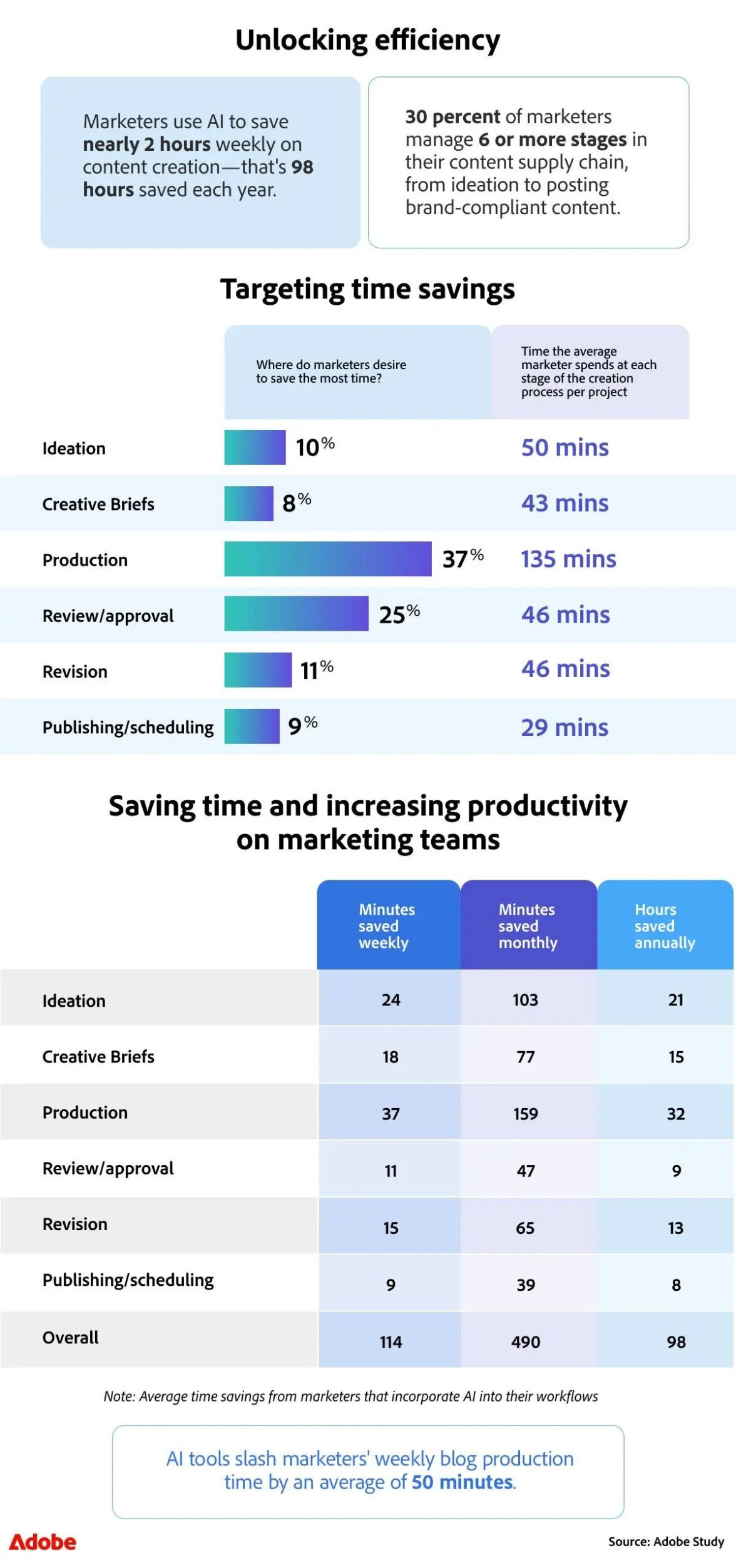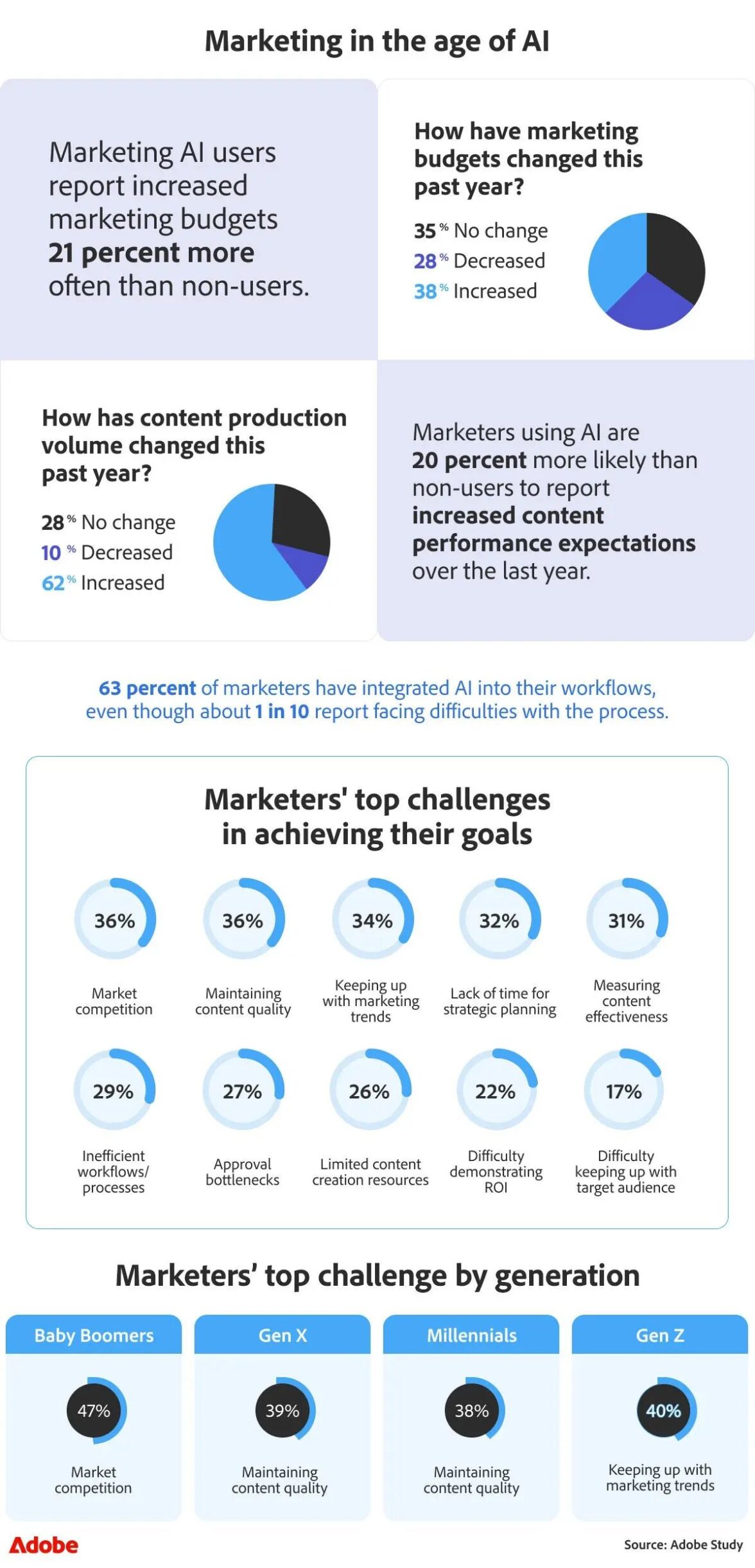 Аналитики Adobe связывают рост производства рекламного контента с внедрением инструментов искусственного интеллекта в процессы создания идей, брифов для агентств, производства рекламы, ее размещения и мониторинга. 63% опрошенных Adobe маркетологов сейчас используют такие инструменты.