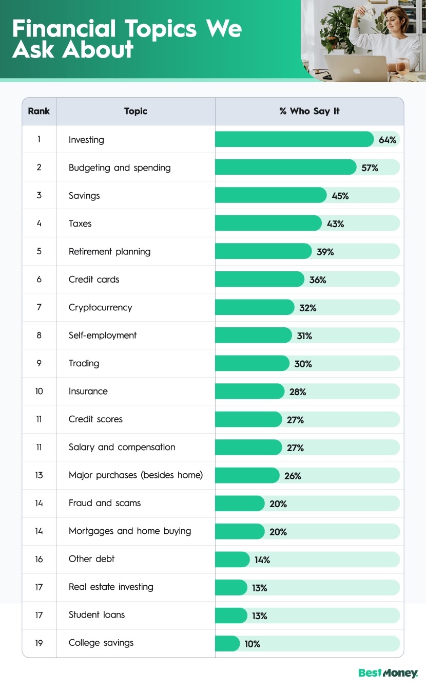 На втором месте — бюджетирование и контроль расходов (57%), на третьем — сбережения (45%). Налоговые вопросы интересовали 43% опрошенных, пенсионное планирование — 39%. Далее следуют кредитные карты (36%), криптовалюты (32%), самозанятость (31%) и трейдинг (30%).