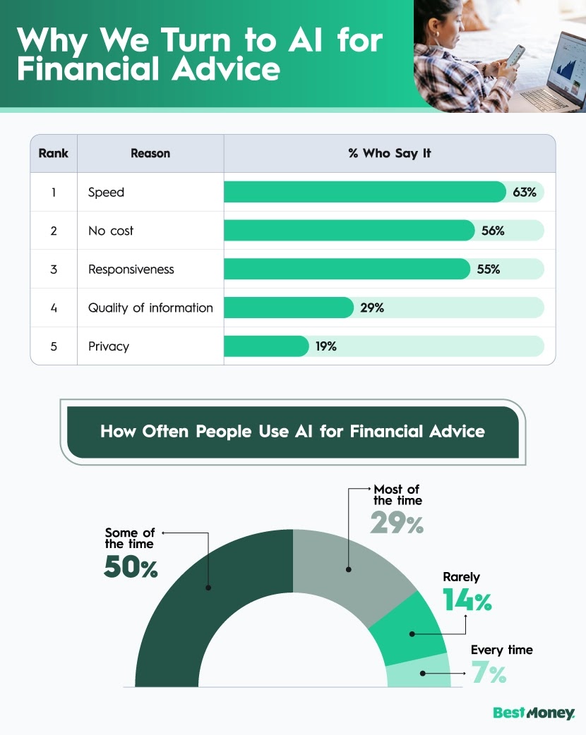 Качество информации назвали важным фактором 29% участников исследования, а конфиденциальность — 19%. Отдельная диаграмма показывает частоту использования ИИ для финансовых советов: 50% американцев обращаются к таким инструментам время от времени, 29% — в большинстве случаев, 14% — редко, и 7% используют ИИ для финансовых вопросов постоянно.