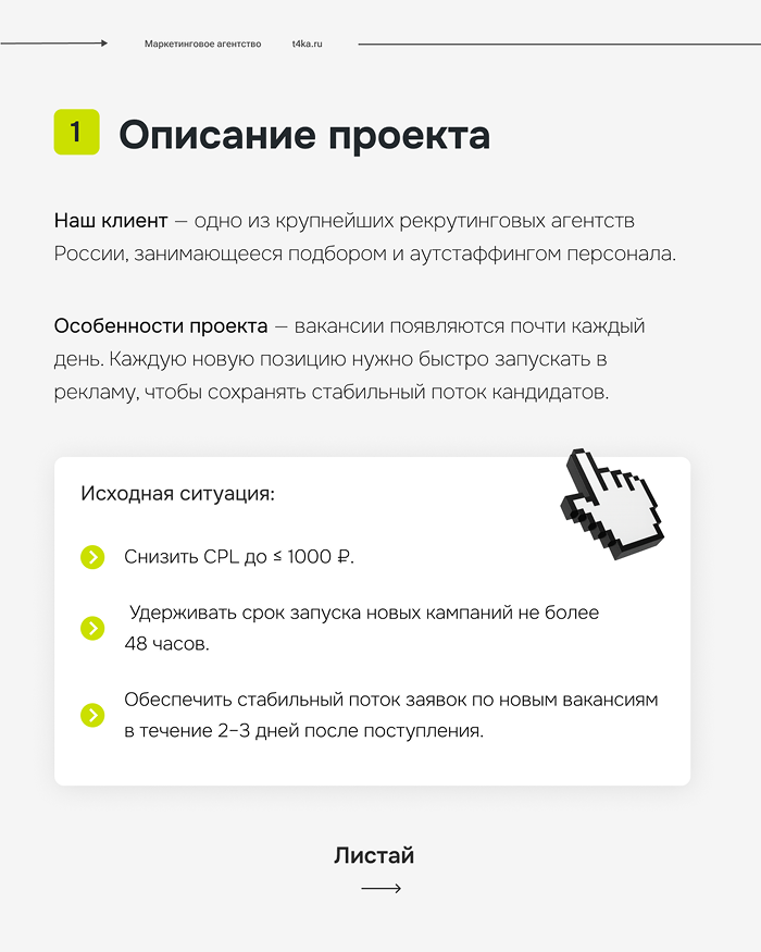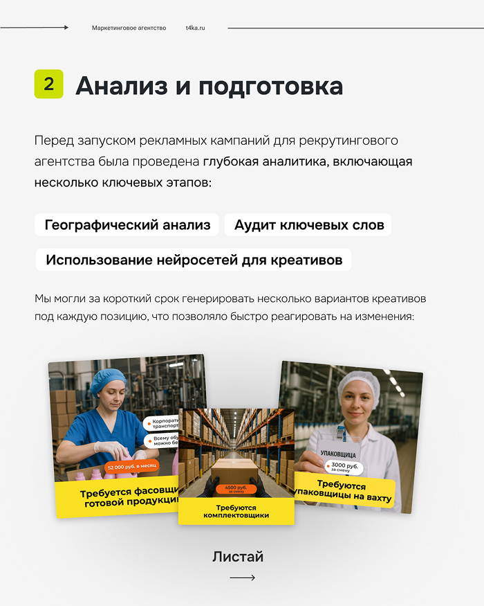 Особенности проектаю. Вакансии появляются почти каждый день, охватывая разные профессии — от рабочих до специалистов. При этом рекламные кампании ведутся под брендом агентства, без указания конкретного работодателя. Каждую новую позицию нужно быстро запускать в рекламу, чтобы сохранять стабильный поток кандидатов.