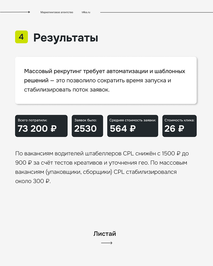 Массовый рекрутинг требует автоматизации и шаблонных решений — это позволило сократить время запуска и стабилизировать поток заявок. Использование нейросетей для генерации креативов показало отличные результаты при корректной настройке промтов. Оперативное реагирование и гибкость в настройке кампаний стали ключом к успеху.После первых недель отключали неэффективные ключевые слова и перераспределяли бюджеты между регионами. Пример: по вакансиям водителей штабеллеров CPL снижён с 1500 ₽ до 900 ₽ за счёт тестов креативов и уточнения гео. По массовым вакансиям (упаковщики, сборщики) CPL стабилизировался около 300 ₽.