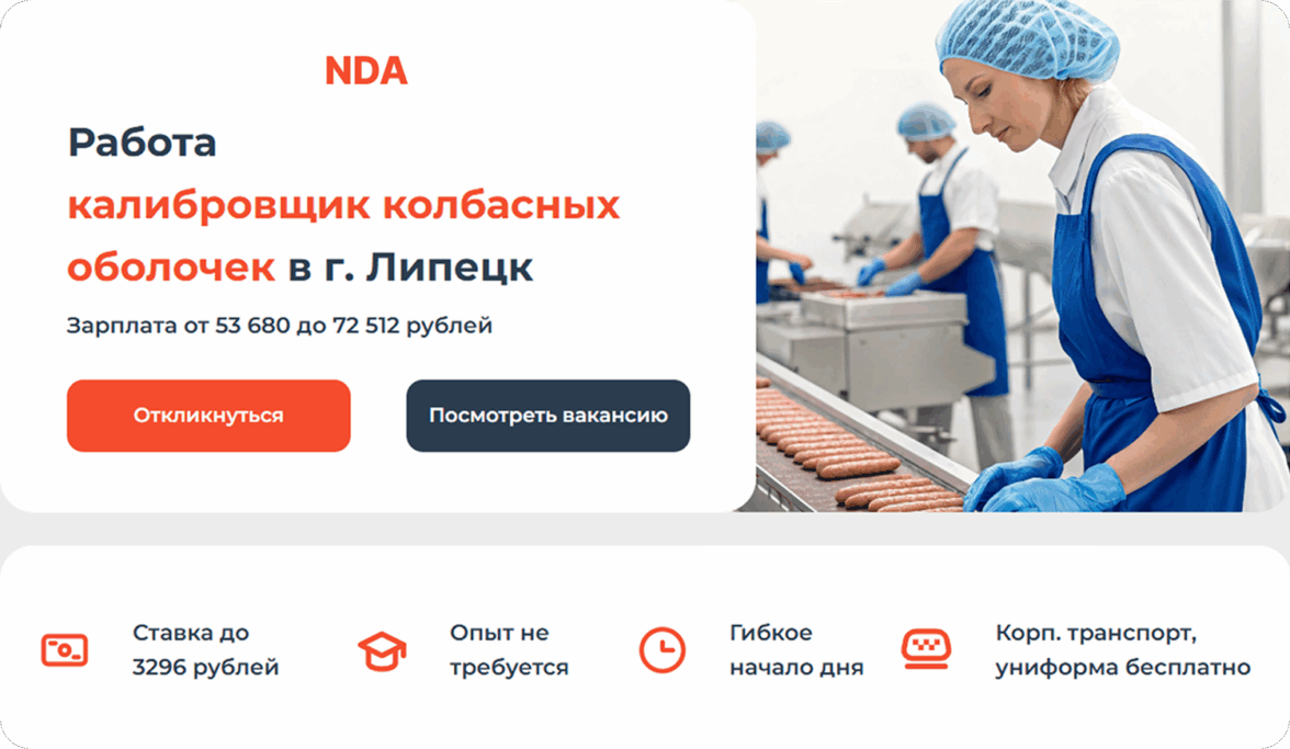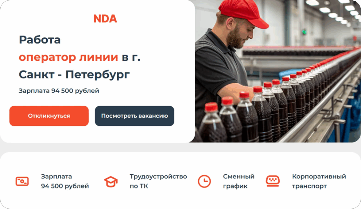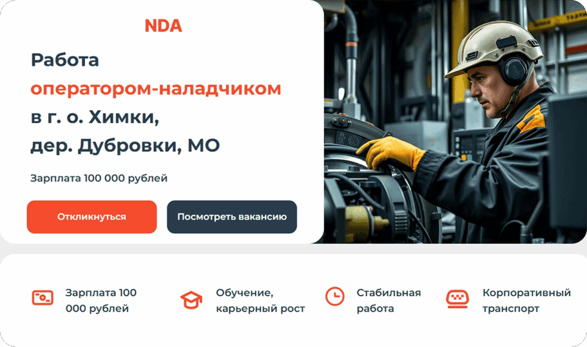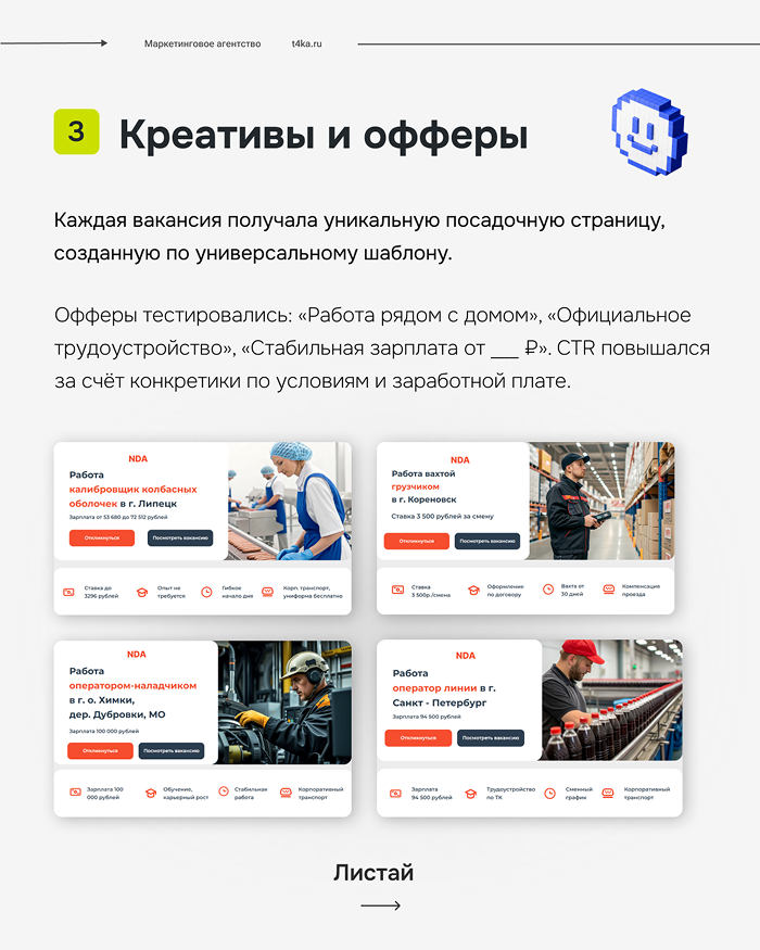 Офферы тестировались: «Работа рядом с домом», «Официальное трудоустройство», «Стабильная зарплата от ___ ₽». CTR повышался за счёт конкретики по условиям и заработной плате.