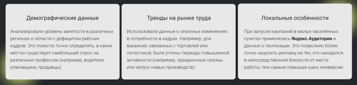 Одним из важнейших аспектов подготовки была географическая сегментация рекламных кампаний. В связи с тем, что вакансии варьировались по профессиям и регионам, был проведен тщательный анализ потребности в кадрах по каждому региону. Мы использовали несколько источников для получения данных о трудовом рынке: