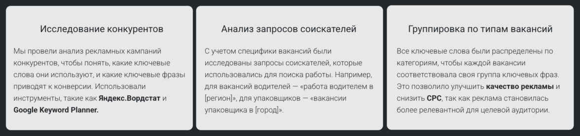 Шаблоны объявлений. Тексты для объявлений также основывались на стандартных шаблонах с учётом специфики вакансии. Мы тщательно разрабатывали такие текстовые блоки, как заголовки, описания и офферы, чтобы они были максимально привлекательными и точными. Шаблоны были настроены таким образом, что могли быстро адаптироваться под разные вакансии.