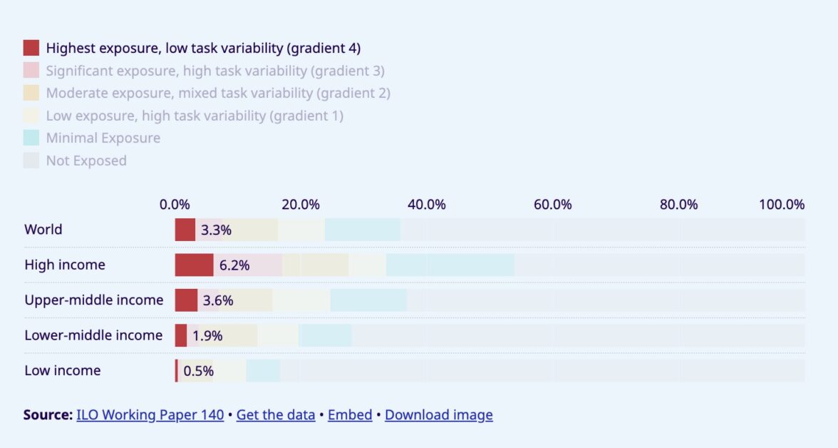В среднем по миру 3,3% профессий попадают в категорию Градиент 4, так что те, кто в них занят в наибольшей степени могут опасаться, что их заменит генеративный ИИ. В странах с высоким уровнем дохода доля таких профессий почти вдвое выше среднемировой — 6,2%. Чем ниже доход страны, тем меньше профессий, которым грозит опасность. В странах с самым низким уровнем дохода лишь 0,5% профессий относятся к наиболее уязвимой категории.
