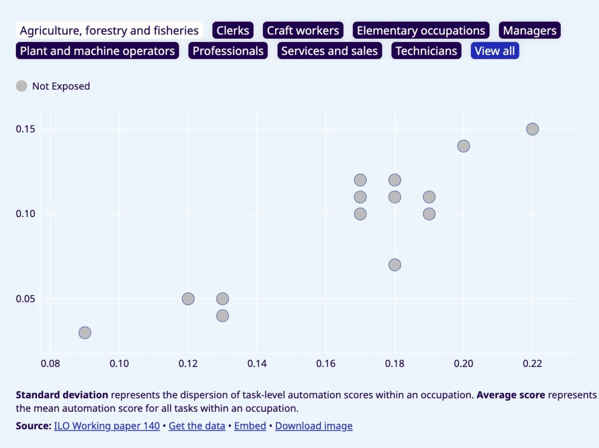 Степень воздействия генеративного ИИ на профессии, связанные с сельским хозяйством, рыболовством и лесным хозяйством (серый цвет точек означает отсутствие влияния).