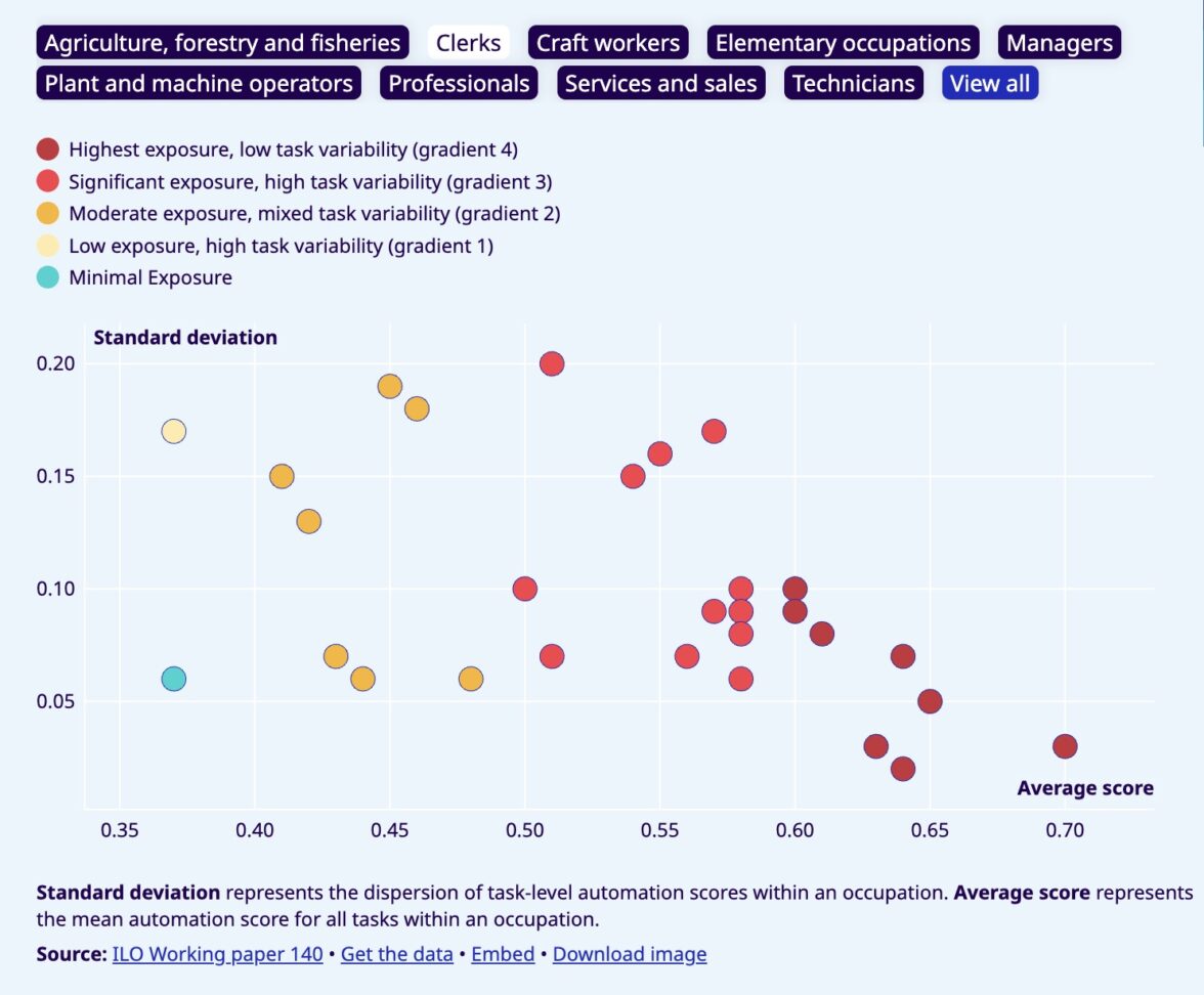 Генеративный ИИ показал себя неблагодарной сволочью. Самый высокий индекс воздействия на профессию среди офисных работников — у специалистов по вводу данных — 0,7.