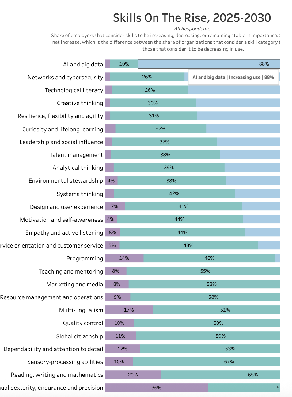 Как видно из графика, рост именно умения обращаться с AI занимает первое место, а за ним следует кибербезопасность и технологическая грамотность.