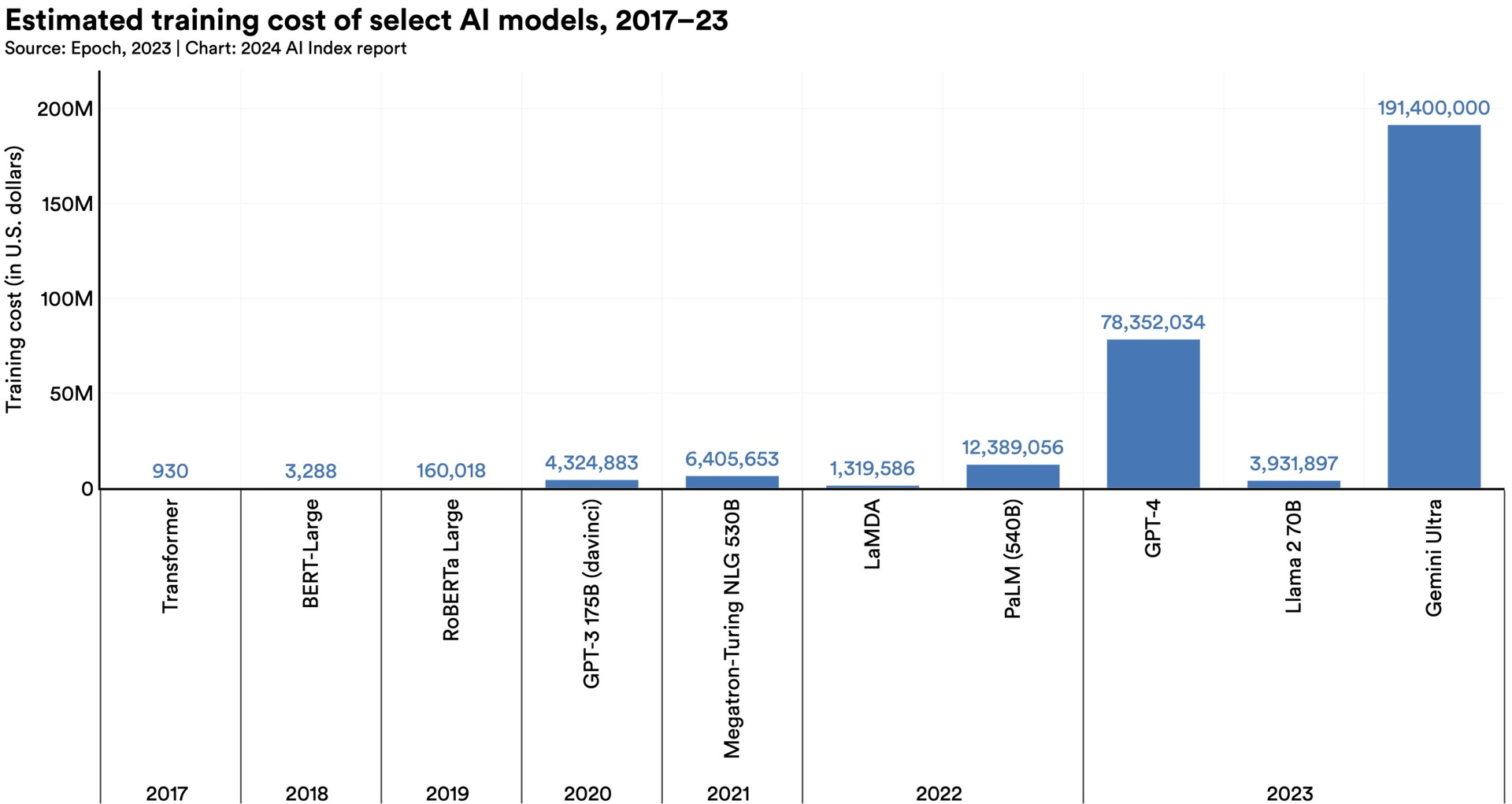 Разработка передовых языковых моделей ИИ становится все более затратной, причем растут затраты стремительно. В отчете приводятся такие оценки: в 2020 году OpenAI потратила $4,3 млн (имеются в виду только использованные вычислительные ресурсы, в случае с OpenAI это были в основном дата-центры облака Microsoft) на обучение GPT-3. Чтобы запустить GPT-4 в 2023-м, потребовалось в 18 с лишним раз больше — $78,3 млн. Первая достаточно способная большая языковая модель Google, запущенная в 2022 году, LaMDA съела компьютерных ресурсов на $1,3 млн. Топовая модель последнего поколения, Gemini Ultra — рекордные $191,4 млн.