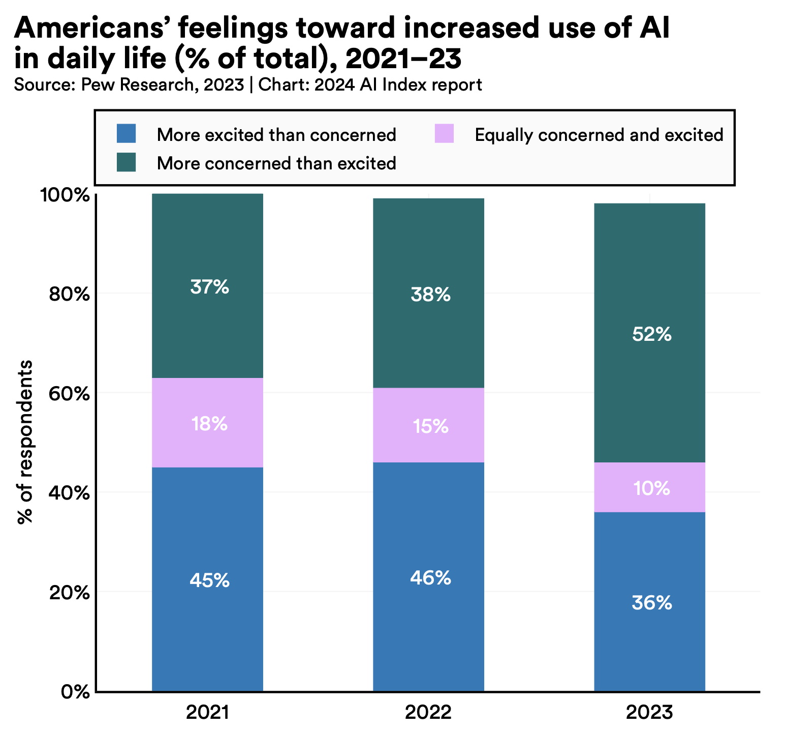 В 2023 году тема ИИ начала по-настоящему широко освещаться за пределами профессиональных медиа, поэтому неудивительно, что рекордное число людей по всему миру — 66%, по данным исследования Pew Research — ожидают из-за ИИ радикальных изменений в своей жизни в ближайшие 3-5 лет. Показательна ситуация в США, где в 2022 году скорее хорошего от ИИ ждали 46% опрошенных, а скорее плохого — 38%. В 2023-м пессимистами оказались более половины — 52%, а оптимистов осталось 36%.