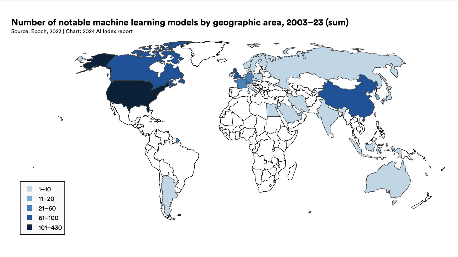 В «Сбере» и «Яндексе» будут огорчены, но их ИИ-модели, выпущенные в 2023 году, отчет стэнфордского института значимыми не считает. Десятку стран-лидеров по числу таких моделей возглавляют США (61 модель), Китай (15) и Франция (8). За ними следуют Германия (5), Канада, Израиль и Великобритания (по 4), Сингапур и ОАЭ (по 3) и Египет (2).