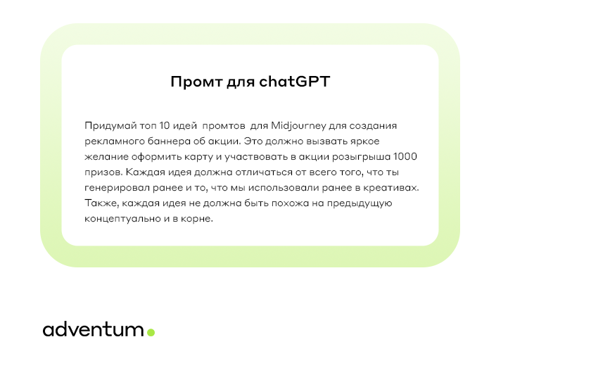 2. Сформировать промпты. На основе текущего УТП рекламной кампании ChatGPT формирует промпт для генераций идей в Midjourney. В промте попросили нейросеть учитывать цель рекламных объявлений — пользователь должен кликнуть на объявление, перейти на сайт, оформить карту и участвовать в розыгрыше призов.