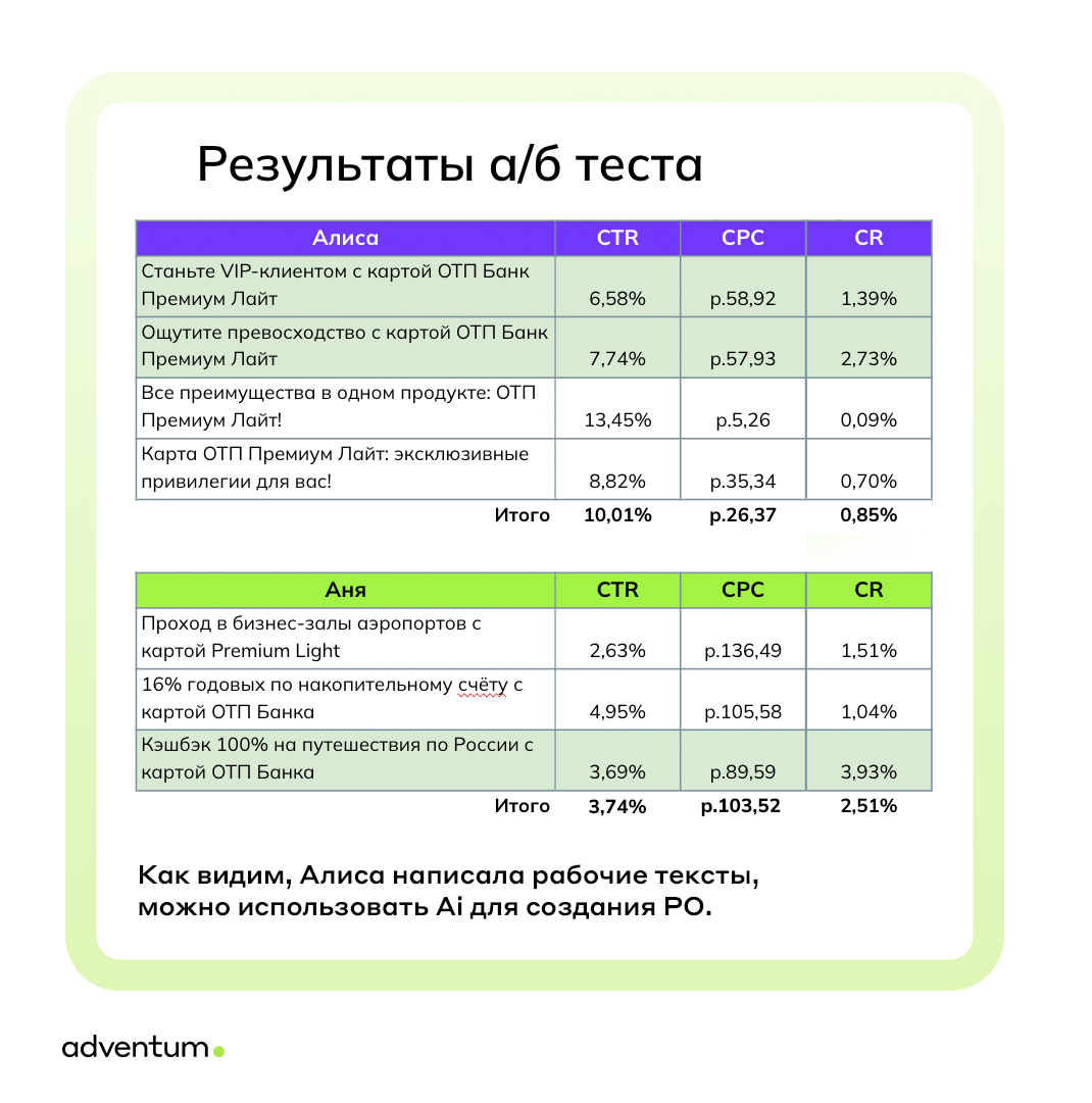 Чтобы оценить эффективность инструмента «Алиса, давай придумаем», мы провели A/B-тестирование, где часть текстов разработал контекстолог, а часть — YandexGPT. Такой подход позволил увидеть разницу в результатах и понять, насколько ИИ справляется с задачей.