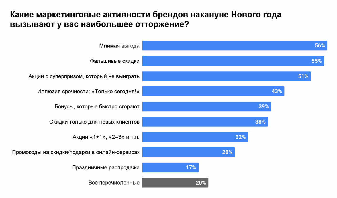 Среди всего разнообразия маркетинговых активностей накануне Нового года наименьший негатив вызывают праздничные распродажи — только 17% опрошенных их недолюбливают. Наконец, 20% респондентов признались, что накануне Нового года их раздражают вообще все перечисленные форматы маркетинга.