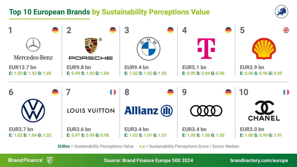 В рейтинге брендов, являющихся лидерами по приверженности устойчивому развитию, практически те же фигуранты, что и в двух предшествующих рейтингах. Бренды оцениваются по трем показателям ESG (environmental, social, governance) — экологическому, социальному и корпоративному управлению. Самые лучшие показатели ESG оказались у Mercedes-Benz. Дальше следуют (в порядке убывания): Porsche, BMW, Deutsche Telecom, Shell, Volkswagen, Louis Vuitton, Allianz. На девятом месте — автомобильный бренд Opel, не вошедший в другие Топ-10. Замыкает десятку самых ESG-брендов Chanel.