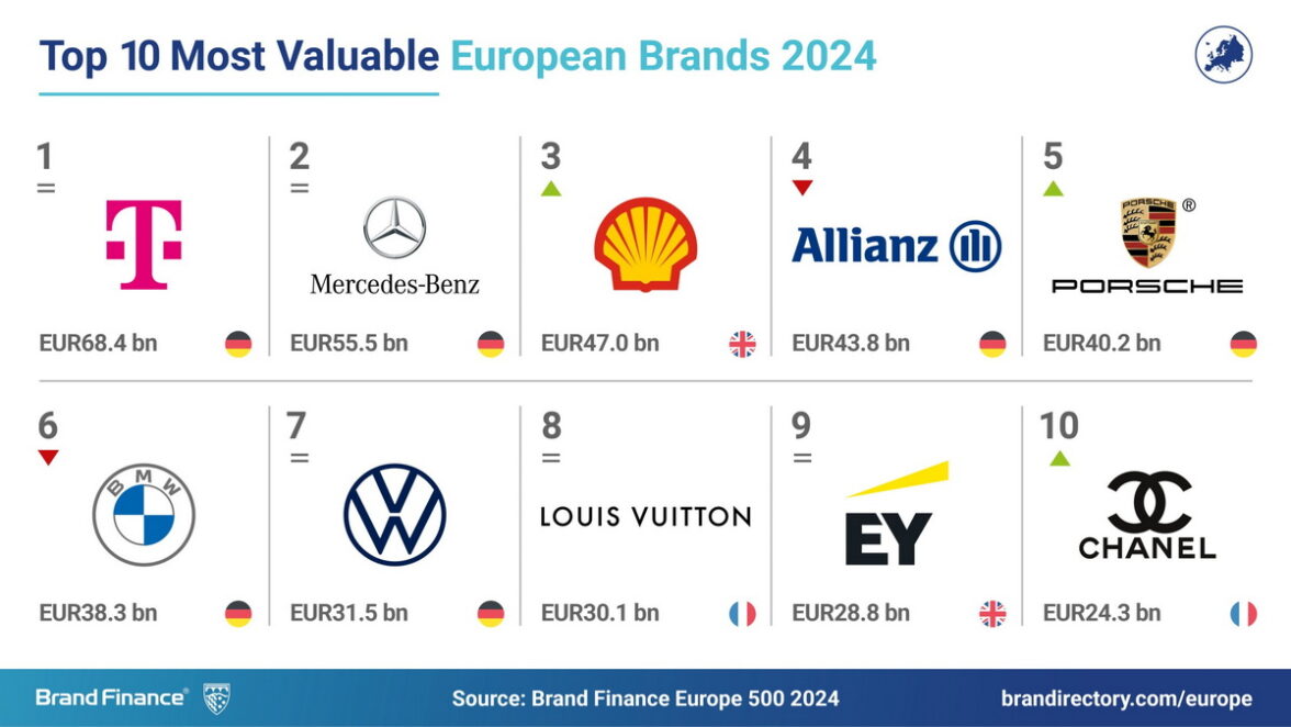 Самый дорогой бренд Европы принадлежит компании Deutsche Telecom — €68,4 млрд. Самый сильный европейский бренд — Rolex. Самый приверженный устойчивому развитию — Mercedes-Benz. Совокупная стоимость 500 ведущих европейских брендов в 2024 году — €2,2 трлн. Эти оценки содержатся в традиционном ежегодном рейтинги Europe 500, выпускаемом компанией Brand Finance.