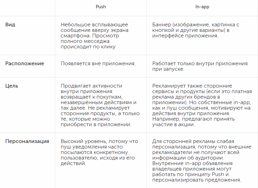 Это способ продвижения для широкой аудитории и часто через креативные форматы (интерактив, геймификацию и другие). От пуш уведомлений in-app отличаются тем, что пользователь видит их только во время использования приложения, тогда как Push появляются и в фоновом режиме. Но оба вида месседжей мотивируют юзера на целевое действие: покупку, скачивание, подписку и так далее.