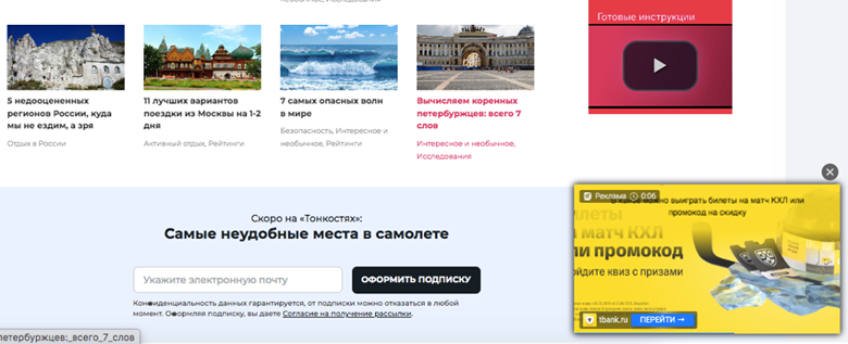 Out-stream показывается вне контентного видеоплеера — между текстовыми или графическими блоками на сайтах и в соцсетях. Основные форматы: in-read (ролик появляется в тексте при прокрутке текста) и sticky/fly-roll («прилипает» к экрану, оставаясь в поле зрения).