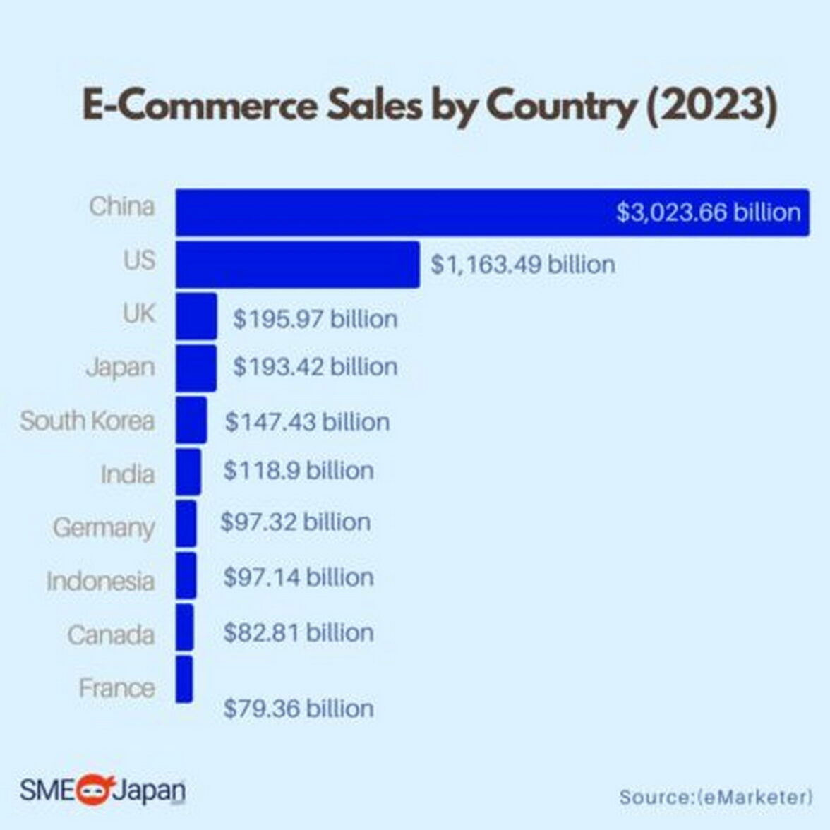 Крупнейшим мировым рынком электронной торговли является Китай. По данным китайского министерства торговли, в 2023 году оборот рынка составил 15,42 трлн юаней ($2,17 трлн), продемонстрировав годовой рост на 11%. В первом полугодии 2024 года оборот онлайн-торговли составил 7,1 трлн юаней ($996 млрд, 9,8% роста по сравнению с аналогичным периодом прошлого года). Компания eMarketer дает более высокую оценку китайского рынка — $3,02 трлн.