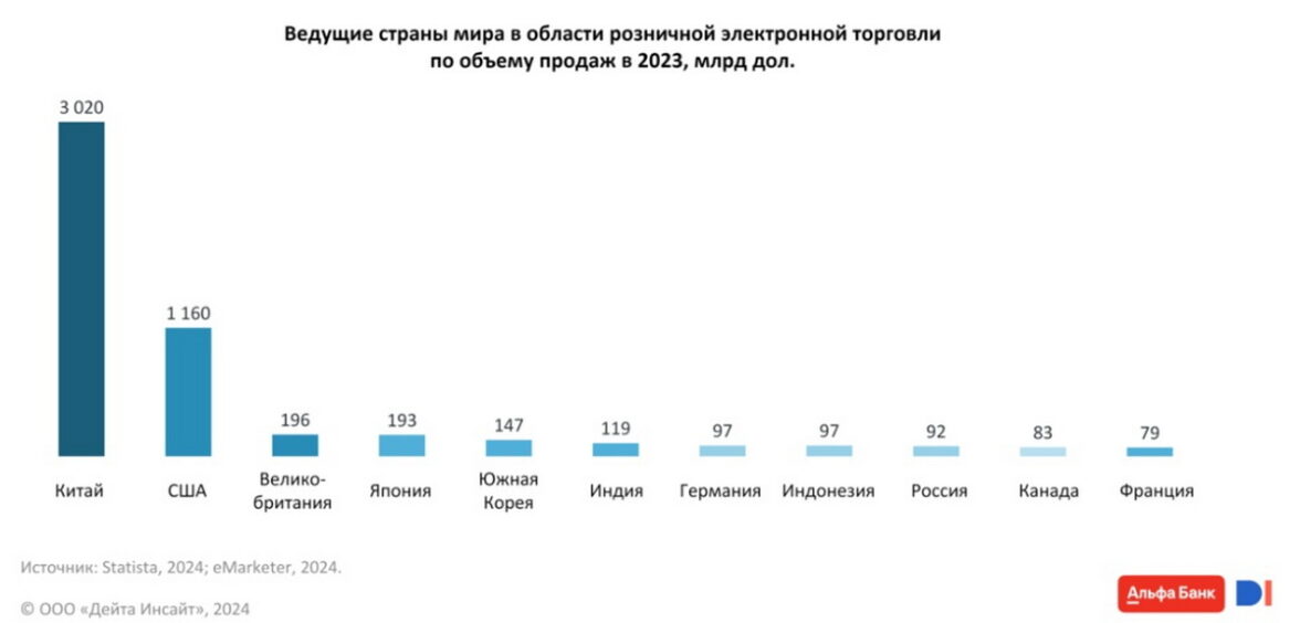 Даже если взять меньшую оценку, неоспорим тот факт, что по итогам 2024 года Китай уже 12-й год подряд станет ведущим мировым рынком электронной торговли.