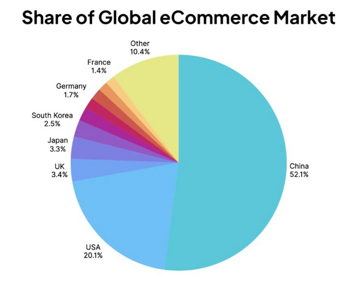 По оценкам eMarketer, на долю Китая приходится более половины (52,1%) всей мировой онлайн-торговли. На долю Китая и США, вместе взятых — почти три четверти (72,2%).