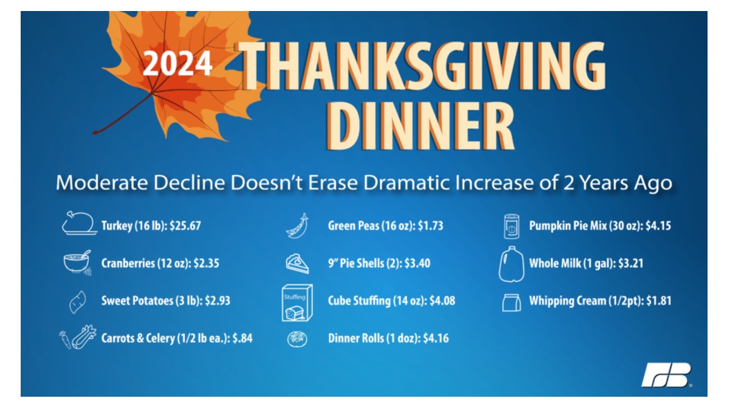 Средняя стоимость ужина на День благодарения была рассчитана с использованием опросов и данных о ценах из всех 50 штатов и Пуэрто-Рико. Добровольные покупатели проверяли цены в магазинах и онлайн. Они искали лучшие без использования купонов на скидку или комбинированных предложений по покупкам.