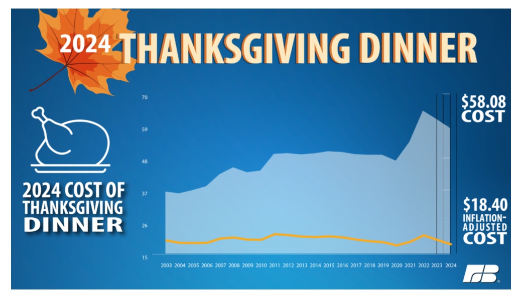 Это на 5% меньше, чем в 2023 году, а тогда ужин на День благодарения стоил на 4,5% меньше, чем в 2022 году. Продолжающееся уже два года снижение цен пока не компенсировало их резкого роста в 2022 году, из-за чего цена застолья достигла тогда $64,06.