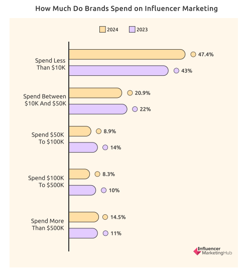 По результатам опроса международных рекламодателей платформы по поиску инфлюенсеров Influencer Marketing Hub, средняя годовая сумма рекламного бюджета на блогеров почти для половины рекламодателей (47%) не превышает $10 тыс. 21% отводят на него $10-50 тыс., при этом доля тех, кто вкладывает больше $500 тыс., сравнительно велика — 14,5% (в 2022 году было 11%).