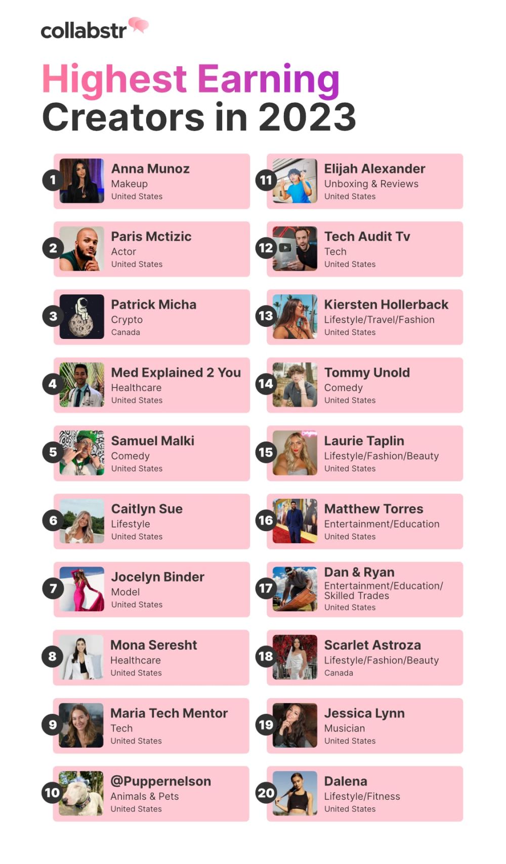 В двадцатке самых высокооплачиваемых инфлюенсеров в 2023 году 18 человек представляли США. Еще двое блогеров — из Канады. Тройка лидеров по заработкам: Анна Муноз (США, макияж), актер Пэрис МакТизик (США) и канадец Патрик Миша (специализируется на криптовалюте и финансах).