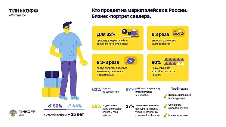 Успех итоговой инфографики кроется в сочетании качественного контента и удачного дизайна. В качестве примера рассмотрим инфографику «Т-Банка» из исследования «Количество продавцов маркетплейсов выросло в 3 раза за год». Она наглядно показывает бизнес-профиль среднего продавца, содержит статистику по среднему возрасту, занятости и отображает основные проблемы продавца на маркетплейсах. Тема крайне актуальная, что уже обеспечивает львиную долю успеха. При этом инфографика привлекательно выглядит и выполнена в фирменных цветах банка: