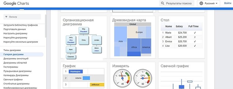 Google также предлагает собственный бесплатный сервис Charts, с помощью которого можно успешно генерировать таблицы разных типов и создавать простую понятную инфографику: