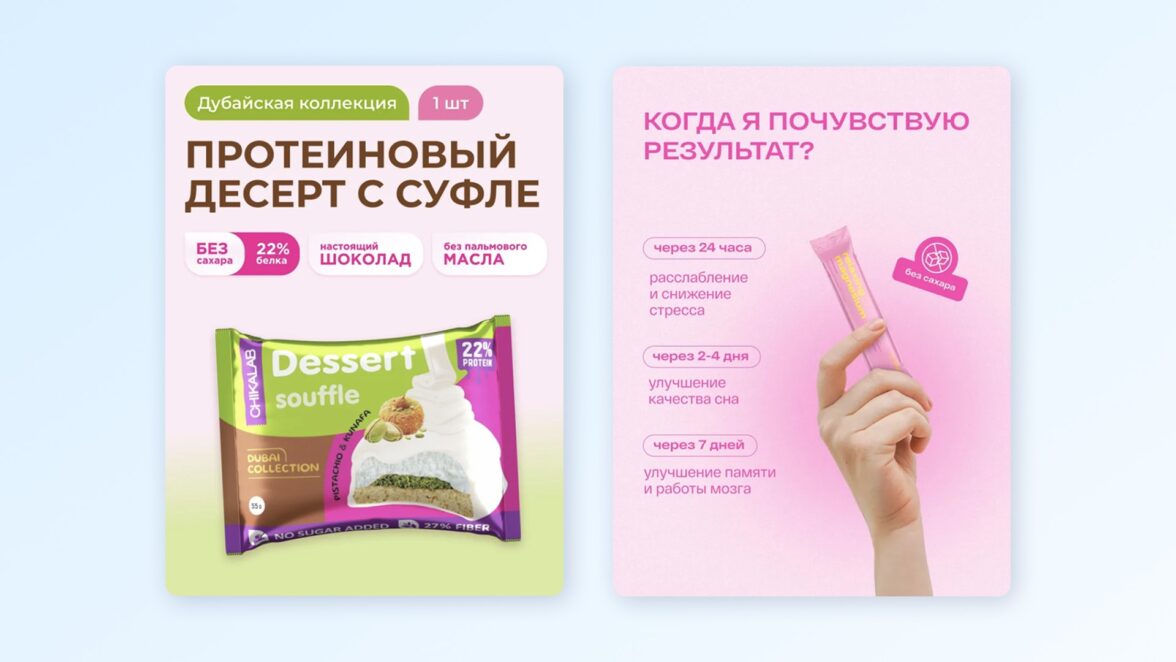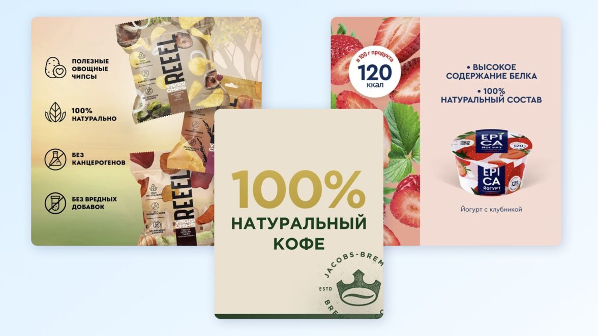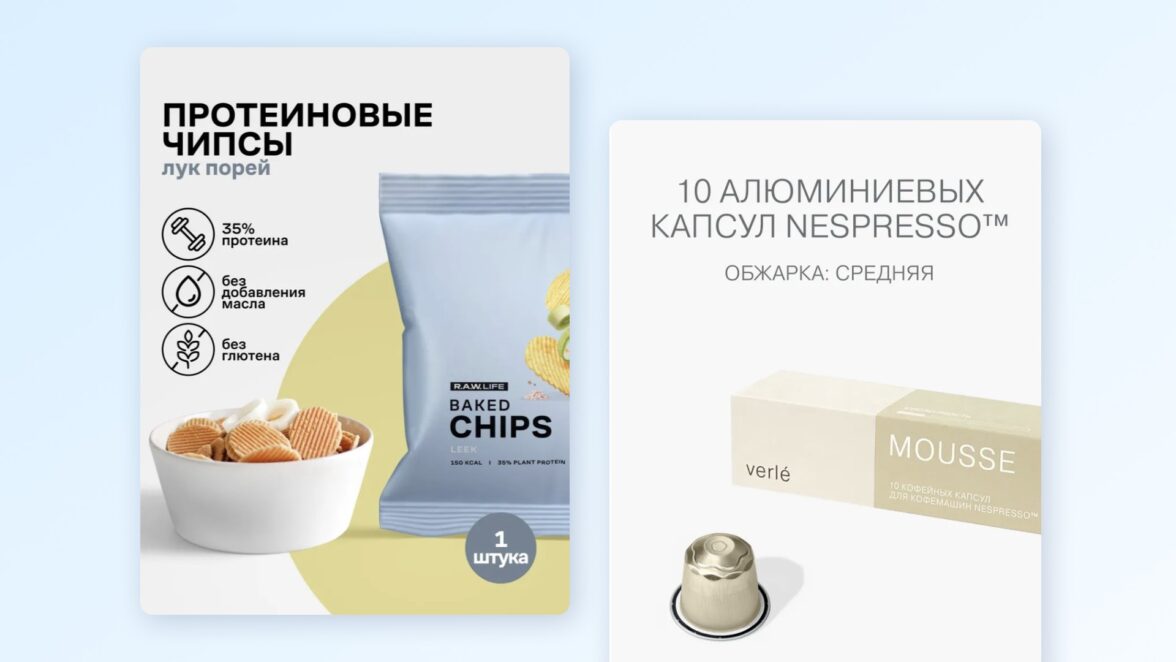 По данным «Нильсен», тренд на здоровый образ жизни и тщательный выбор продуктов проявляется в самых разных категориях. Так, например, растут продажи растительных альтернатив: продажи безлактозной продукции с сентября 2024 по сентябрь 2025 увеличились на офлайн рынке на 43,5% и на 81% на онлайн рынке, а продажи протеиновых снеков на 28%. Этот тренд влияет и на визуальный язык инфографики — всё больше внимания уделяется trust-бейджам, информации о составе и происхождении, следует из внутреннего исследования Okkam за май 2025 года.