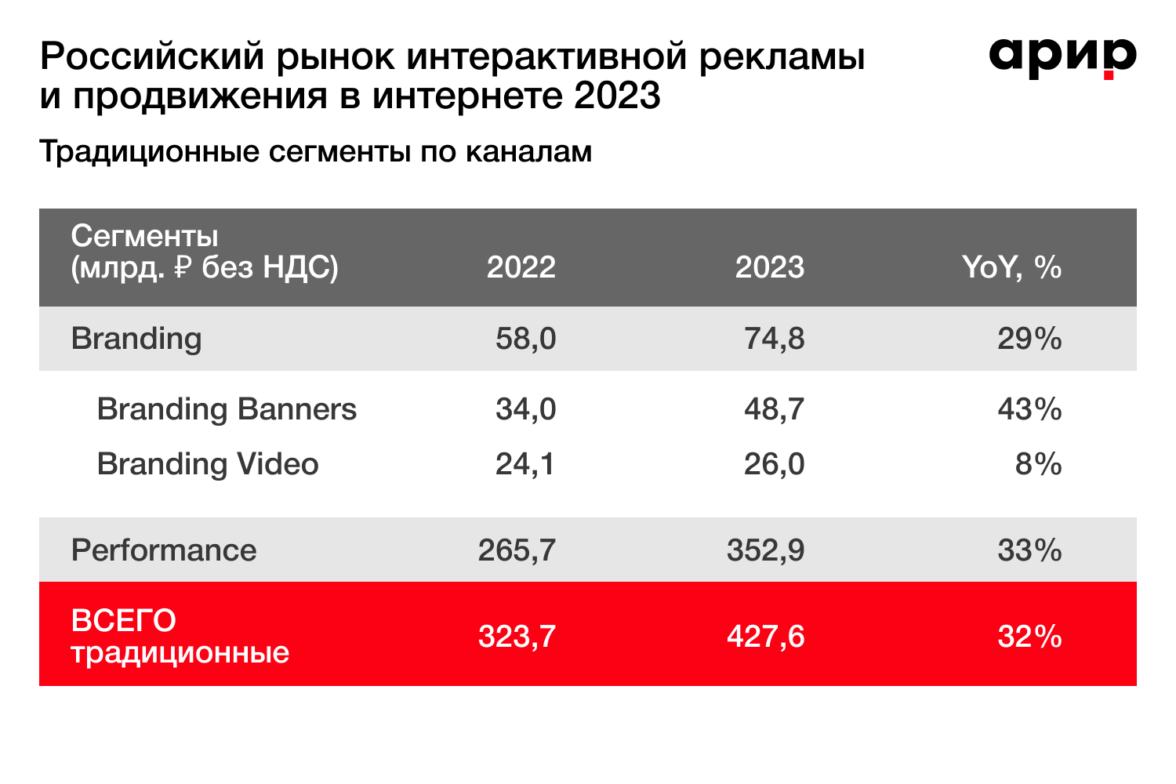 По оценке экспертов АРИР, объем российского рынка интерактивной рекламы и продвижения в интернете увеличился на 55% в 2023 году и составил 807 млрд рублей. Сегмент performance-рекламы составил в 352,9 млрд рублей — он увеличился на 33%.