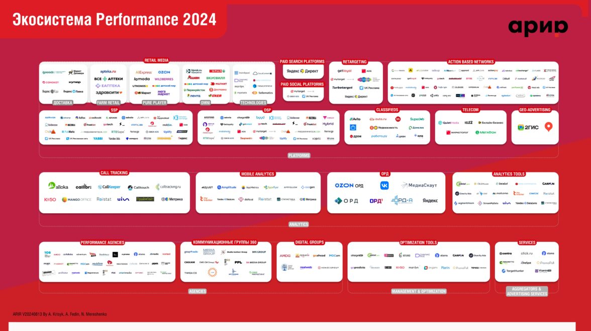 Участники разделены по коммуникационным и digital-группам с акцентом на агентства, специализирующиеся на performance-маркетинге. Экосистема отражает актуальный список агентств, технологий и продуктов, доступных на российском рынке, и помогает рекламодателям легко сориентироваться при выборе партнера по performance-маркетингу.