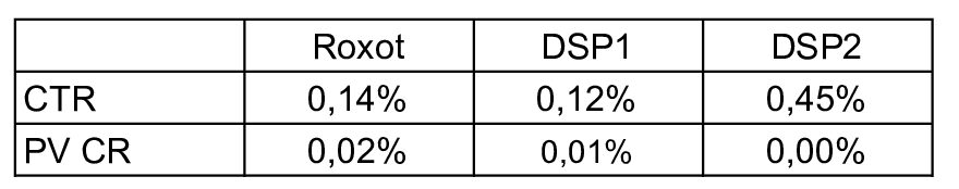 Roxot выдержал CTR на уровне 0,14%, результат DSP2 = 0,45%, но конвертация в заказы значительно ниже. Показатель поствью конверсии первичен для оценки эффективности — нет смысла в кликах, которые не приносят клиенту продажи. Roxot привлекает только качественный трафик, который конвертится в заявки.