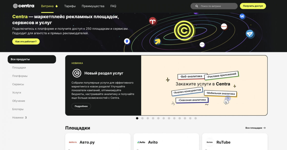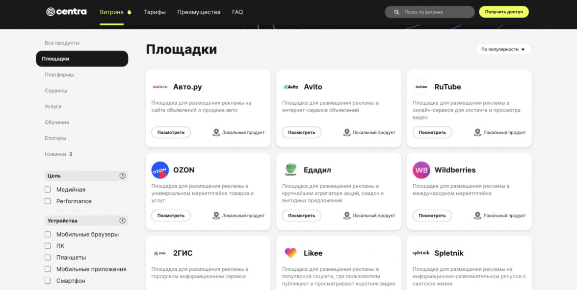 Мы специализируемся на обслуживании компаний с гибридным или инхаус-форматом, и уже не раз проходили с клиентами путь от консалтинга и формирования команды до создания системы оптимизированной закупки: в Centra можно найти практически весь перечень популярных рекламных продуктов: сейчас на платформе можно подключить более 250 площадок и сервисов.