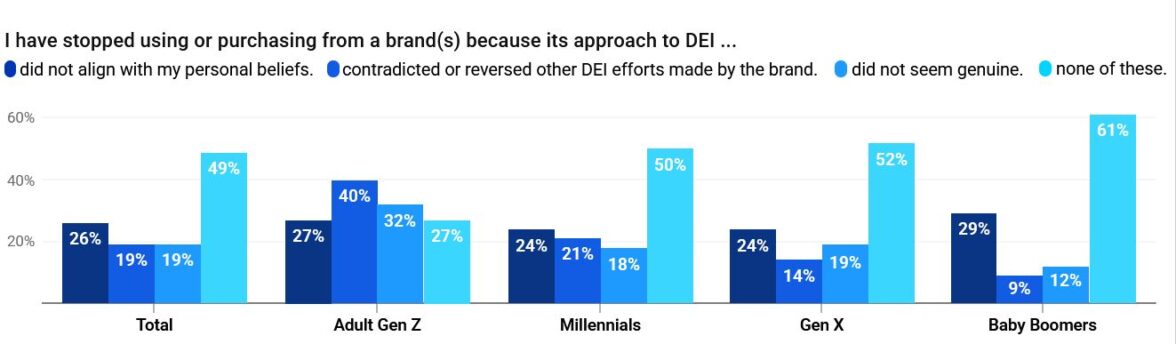 Молодежь не поддерживает отказ брендов от принципов разнообразия, равенства и инклюзивности, о котором заявляют все больше американских компаний. По результатам опроса исследовательской компании Harris Poll и издания о рекламе Ad Age, 40% представителей поколения Z в возрасте 18-28 лет отказались от покупки брендов из-за сворачивания политики инклюзивности, в целом по всем поколениям американцев эта доля в два раза ниже — 19%. Чем старше респонденты, тем их отношение брендам, отступивших от своих принципов, лояльнее. Об отказе от покупки брендов, больше не пропагандирующих DEI, объявили 21% миллениалов (29-44 лет), 14% иксов (45-60) и лишь 9% беби-бумеров (61-79).