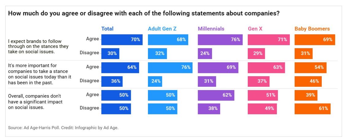 Для пятой части (19%) всех опрошенных Ad Age и 32% зумеров причиной бойкота брендов, отказавшихся от политики равенства, является неискренность их позиции и вынужденность действий. 27% зумеров и 26% всех респондентов заявляют, что изменившаяся политика брендов теперь не соответствует их личным воззрениям.