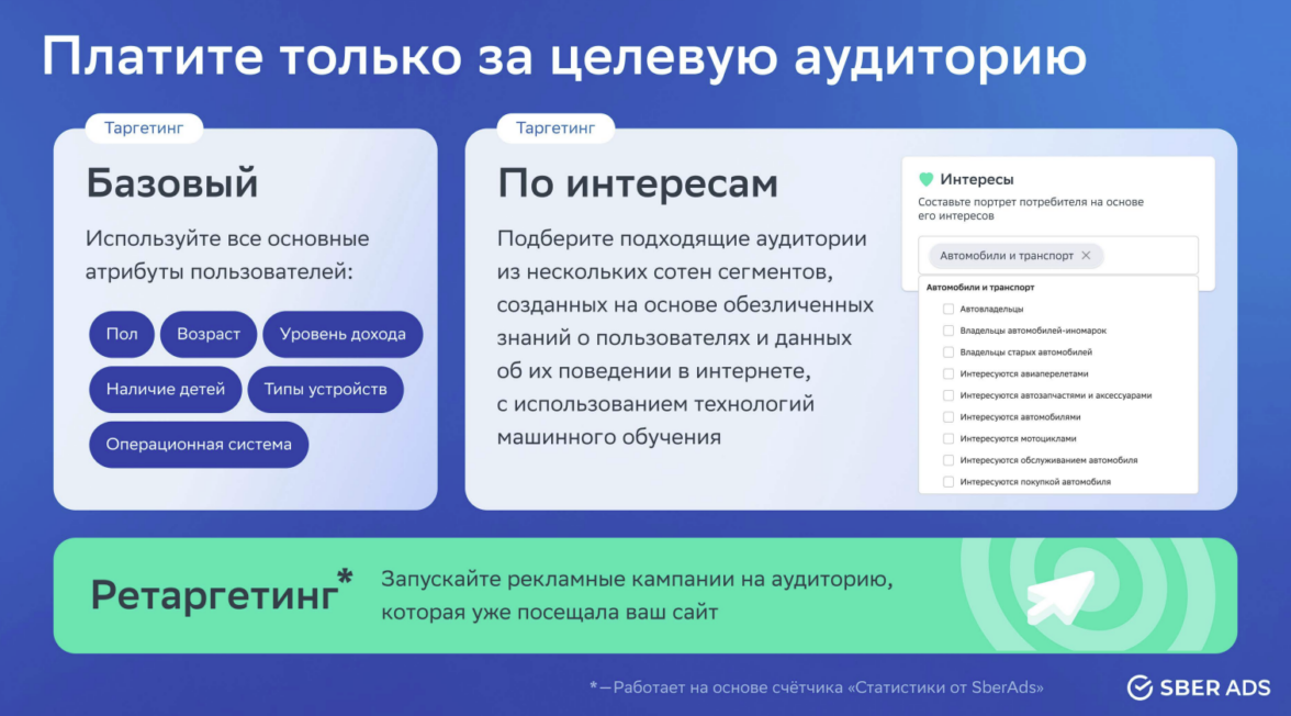 Такое разнообразие позволяет рекламной платформе понимать поведение и предпочтения клиентов глубже, чем это возможно при использовании стандартных методов аналитики. На основе этих данных SberAds создаёт сегменты аудитории, точно подбирая тех, кто с наибольшей вероятностью откликнется на предложение. Например, вы сможете нацелиться на клиентов, которые регулярно покупают определённые товары, интересуются образованием, каршерингом или ищут новые возможности для развлечений. Это не просто таргетинг — это адаптация рекламы под реальные потребности людей. Точность рекламных кампаний и оценку их эффективности усиливает установленный на сайте рекламодателя счётчик Статистики от SberAds.