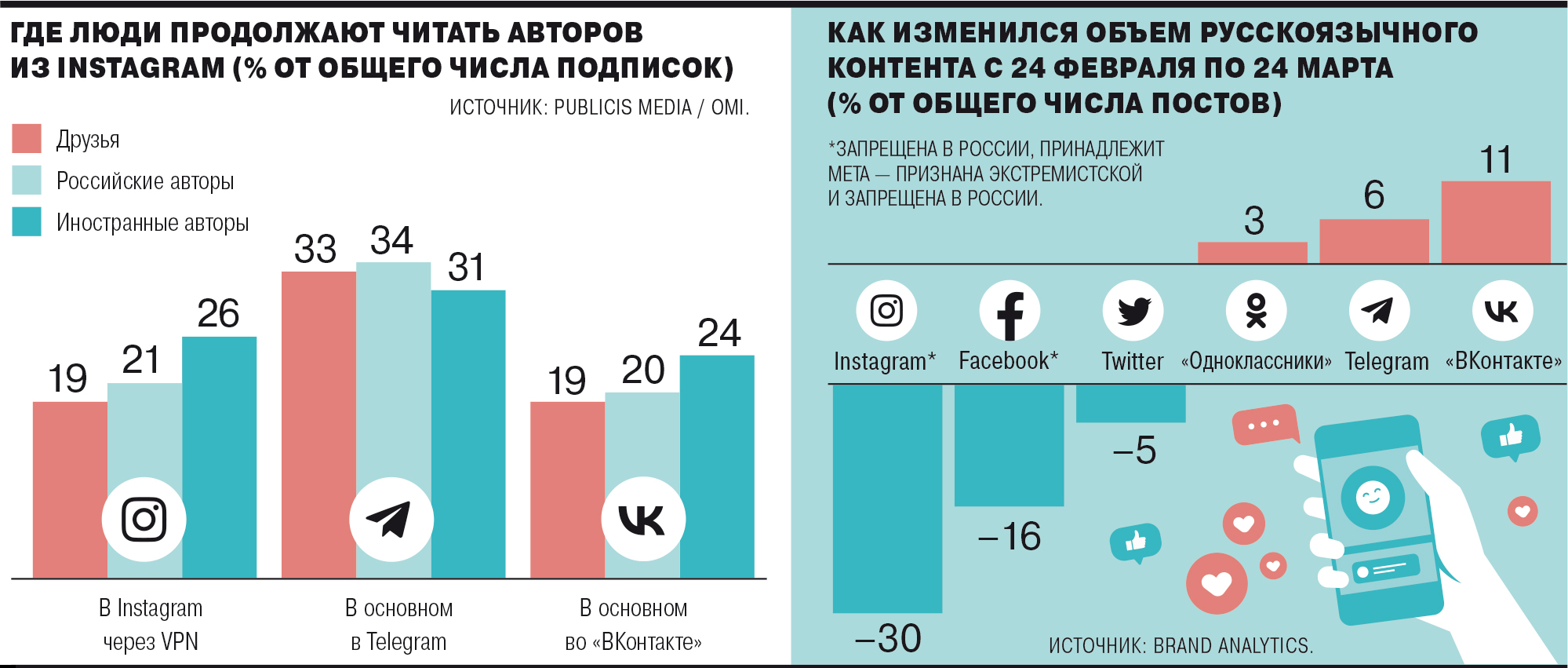 Однако для блогеров все не так радужно. Кирилл Борисов, гендиректор агентства LabelUp, рассказал «Коммерсанту», что только 10–20% аудитории блогеров с зарубежных платформ перешли за своими кумирами на другие площадки. С ним согласен и Василий Черный, директор по маркетингу Brand Analytics: по его словам, при переходе из Instagram в другие соцсети блогеры могут потерять 15–20% «старой» аудитории, а с учетом искусственно накрученной — до 50–70%. По мнению Черного, существенная доля пользователей могут не подписаться на автора на других площадках, осознав, что за ним стало неинтересно следить.