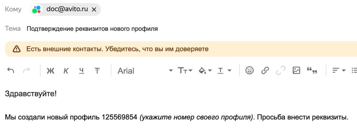 Для полноценной работы кабинета нужно подтвердить реквизиты компании. Это делается вручную: нужно отправить письмо в адрес Авито.
