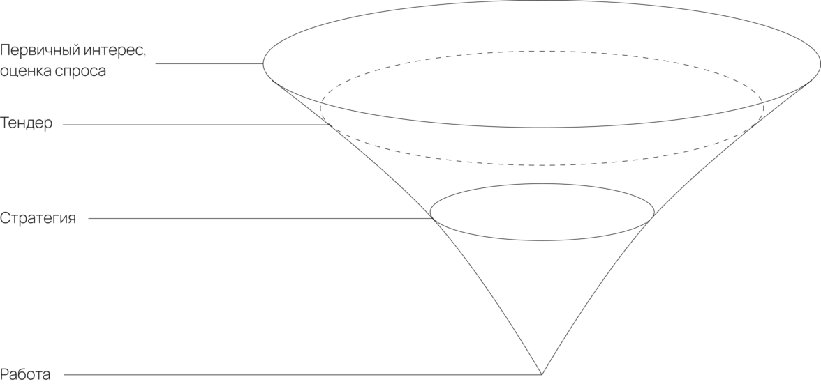 Важно понимать, что брифинг — не первое касание с клиентом. До этого ещё нужно оценить первичный интерес или мотивацию: действительно он готов работать или набирает участников для фейкового тендера, и что там вообще по бюджету.