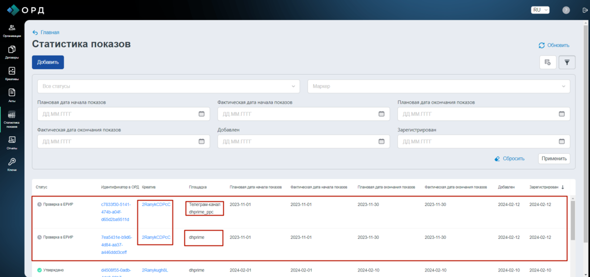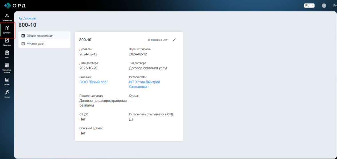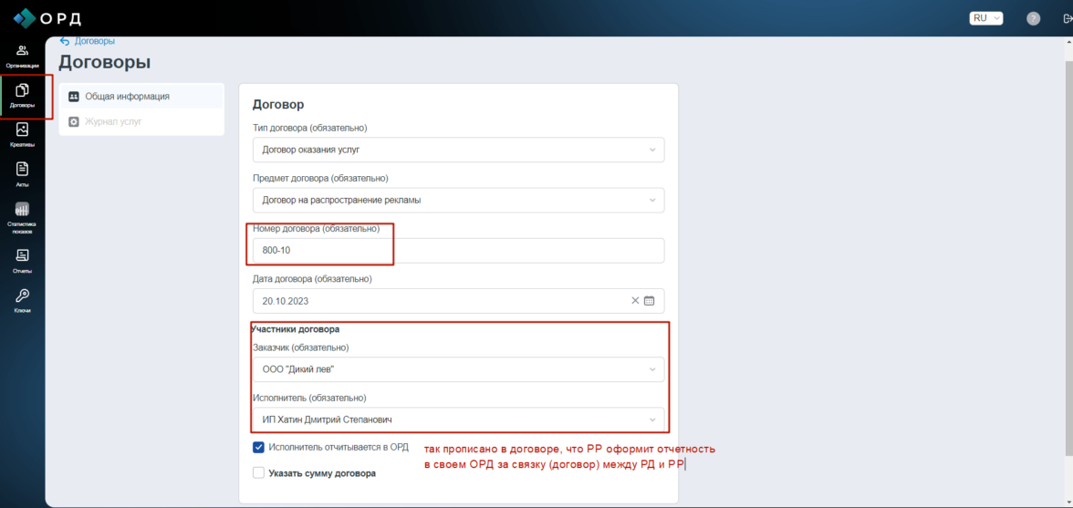 В результате РР дополнительно в блоке Договоры занесет в свое ОРД договор Рекламодатель — Посредник, помимо своего доходного договора Посредник — Рекламораспространитель.