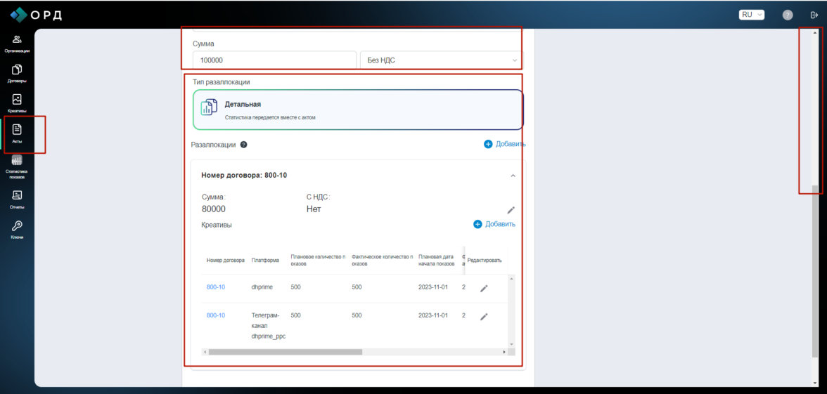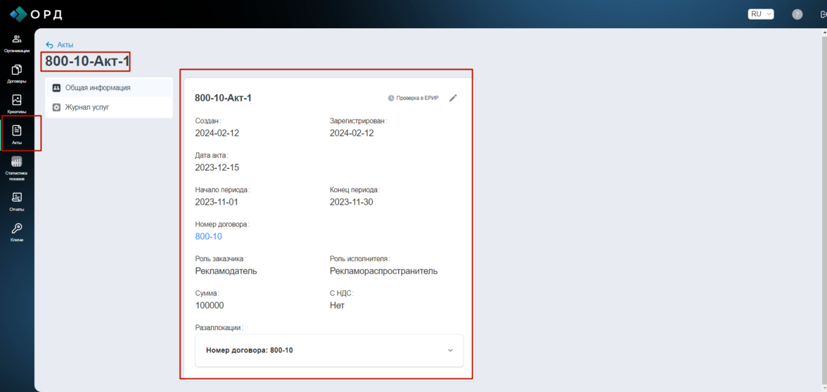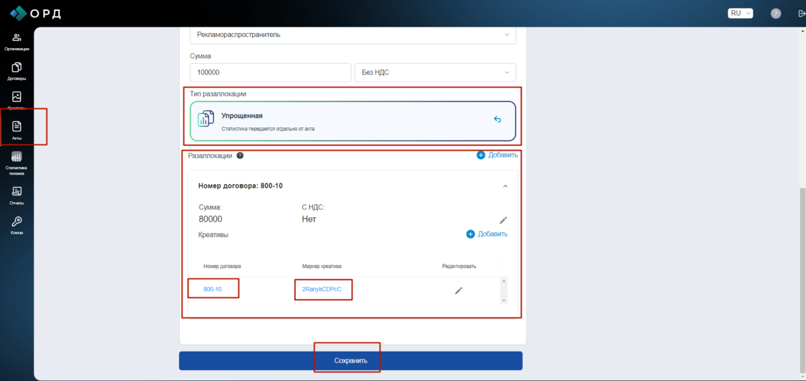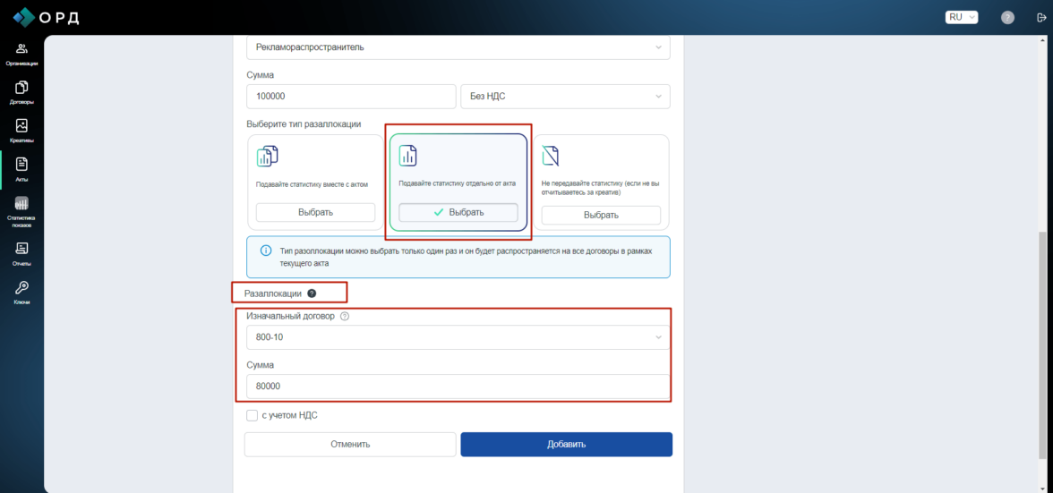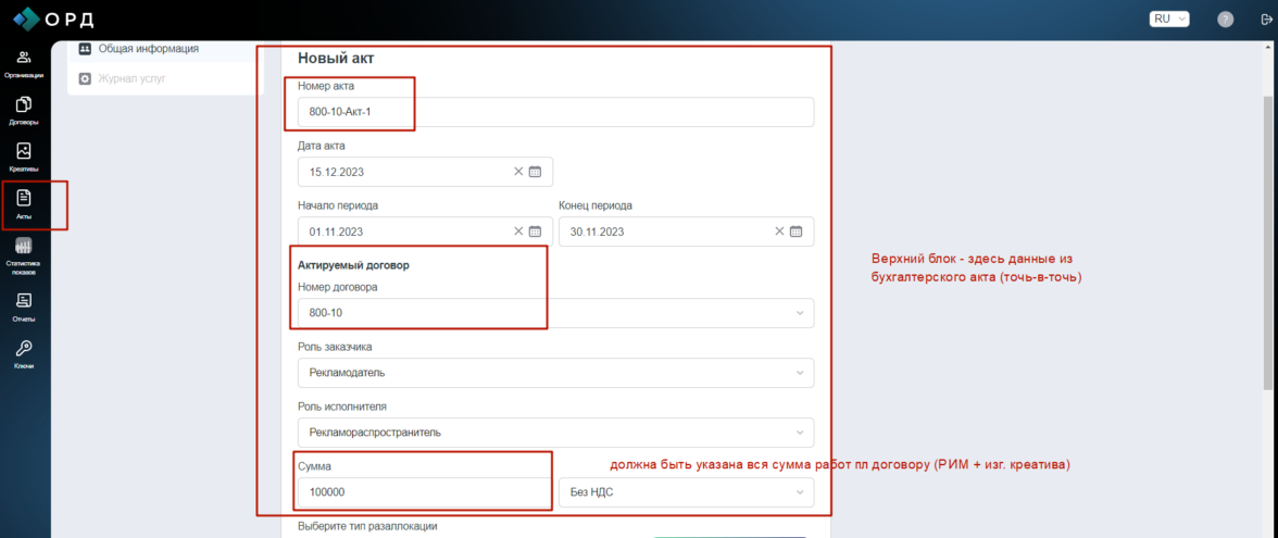 После окончания размещения РИМ Рекламораспространитель (блогер) должен оформить и передать Рекламодателю бухгалтерские акты, а также занести атрибуты бухгалтерского акта в ОРД в блоке Акты с разаллокацией по Изначальному договору и данные по показам в блоке Статистика с разаллокациями по креативам и площадкам.