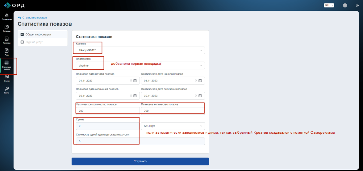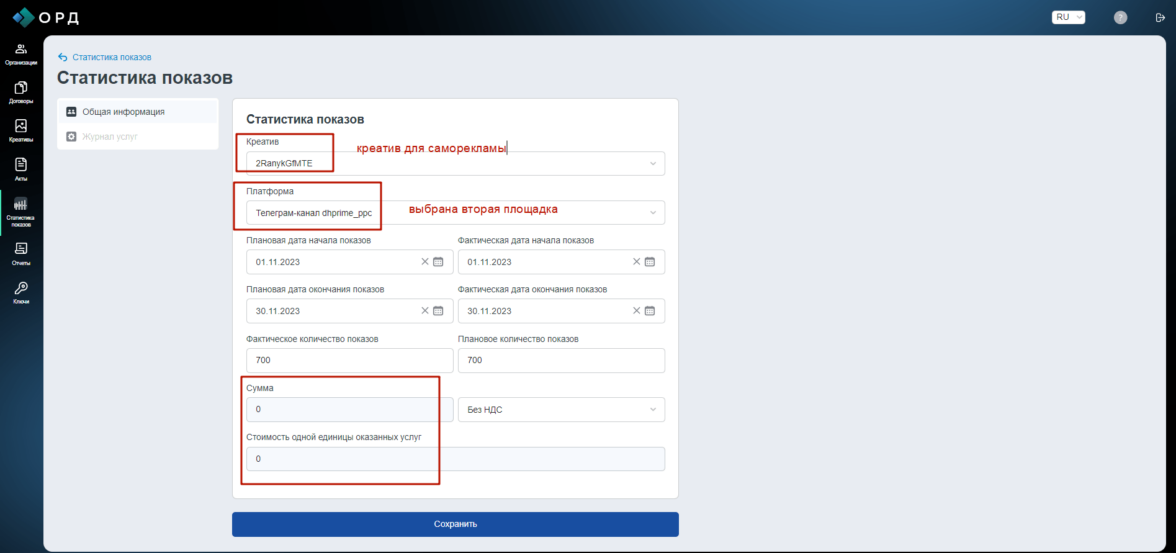 Стоит заметить, что если бы самореклама после размещения в ноябре 2023 года не была «демонтирована», то Рекламораспространитель каждый месяц будет заносить количество показов с нулевыми суммами в блок Статистика без заполнения блока Акты. Имело бы место, так называемая, вечная отчетность.