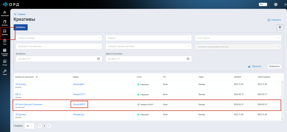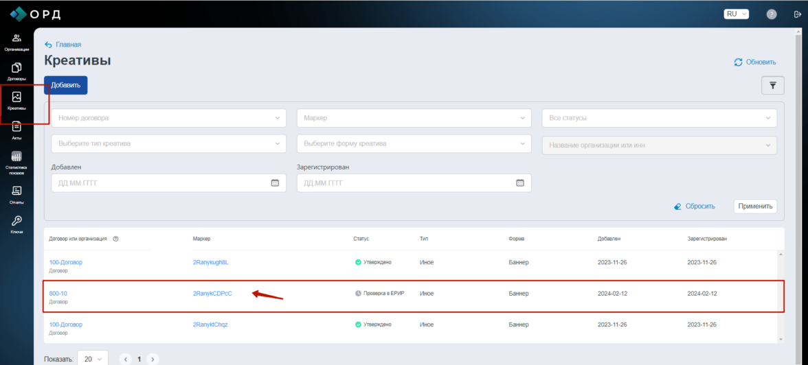 Теперь необходимо, чтобы РР, согласно договору 800–10 от 20.10.23, загрузил креатив и получил токен в блоке Креативы.