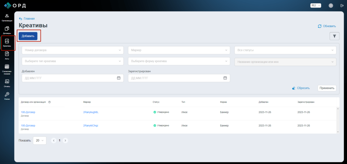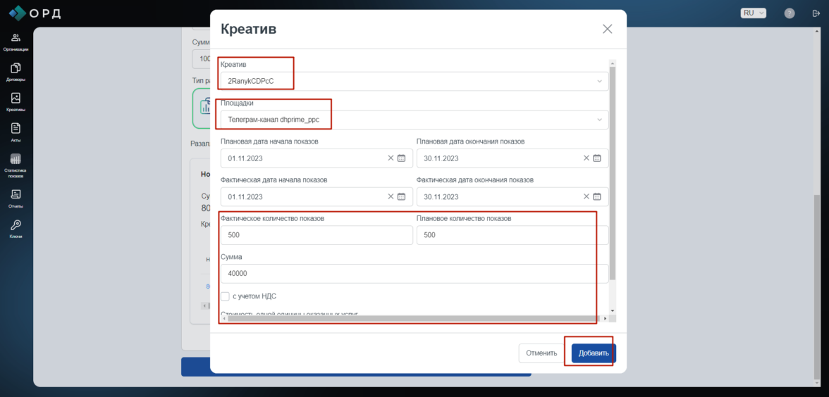 Прикрепление креативов в блоке Креативы всегда производится к Изначальному договору (договор между Рекламодателем и его первым контрагентом). В нашем случае, при короткой рекламной цепочке по нашему Первому сценарию, Изначальный договор и договор РД-РР это одно и то же, поэтому в блоке Креативы указан наш договор № 800–10 от 20 октября 2023 года.