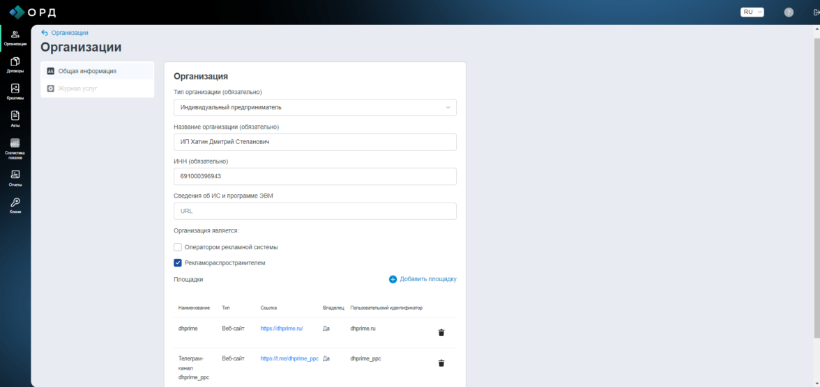 Пользователь может использовать свой ИНН как контрагента в любых иных рекламных цепочках, но уже в статусе как РД, так и РА. Любая платформа ОРД позволяет это, что обеспечивает гибкость и масштабируемость для выполнения более широкого круга задач. Поэтому статус РР, который получил пользователь при регистрации на платформе своего аккаунта это не клеймо, а всего лишь одна из ролей, которая будет для него доступна в системе.
