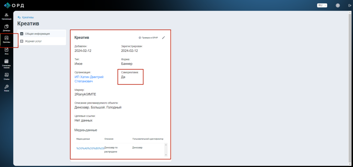 В итоге все необходимое в плане отчетности в своем ОРД для оформления саморекламы Рекламораспространитель сделал.